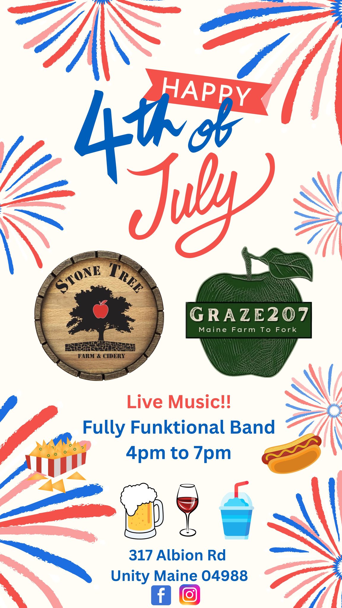 Stone Tree Farm & Cidery 317 Albion Rd, Unity, ME, United StatesCome celebrate Independence Day with us at Stone Tree Farm & Cidery, alongside our friends Graze207! We’re bringing together local flavor, great drinks, and live music for a fun-filled afternoon in Unity, Maine. What’s Happening: Live music from Fully Funktional Band (4 PM – 7 PM) Delicious farm-to-fork food from Graze207 Craft cider, beer, wine, and wine slushies! Family-friendly […]